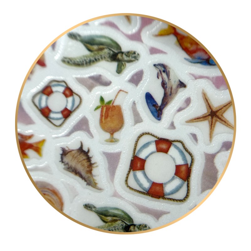 - Jeśli zachodzi taka potrzeba to możesz zabezpieczyć naklejkę cienką warstwą Base Gel Soak Off i utwardzić lampie 30 sekund. Przy większych naklejkach zapobiega to powstawaniu zapowietrzeń i odspajaniu.